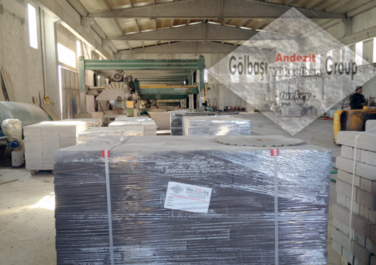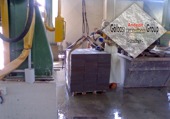| Başkesme makinası ile ebatlanmış andezit paletlenir. |